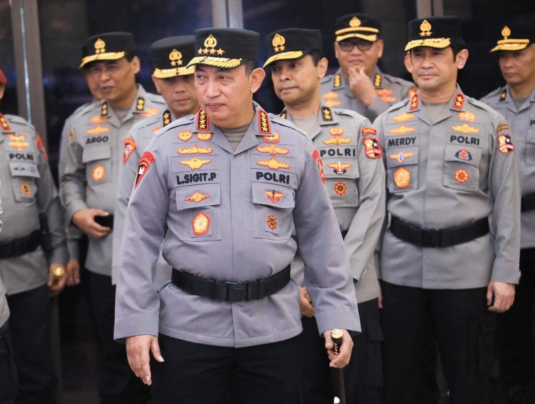 Jakarta – Kapolri Jenderal Listyo Sigit Prabowo memimpin upacara korps raport kenaikan pangkat 4 perwira tinggi (pati) dan perwira menengh (pamen) Polri di Rupattama Mabes Polri, Jakarta, hari ini.