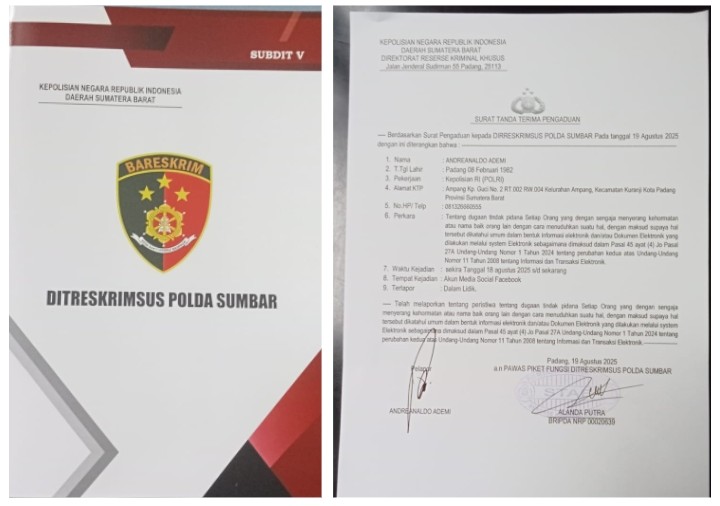 PADANG | Direktorat Reserse Kriminal Khusus (Ditreskrimsus) Polda Sumatera Barat resmi menerima laporan Andreanaldo Ademi terkait dugaan tindak pidana pencemaran nama baik melalui media sosial Facebook, Padang 19 Agustus 2025.