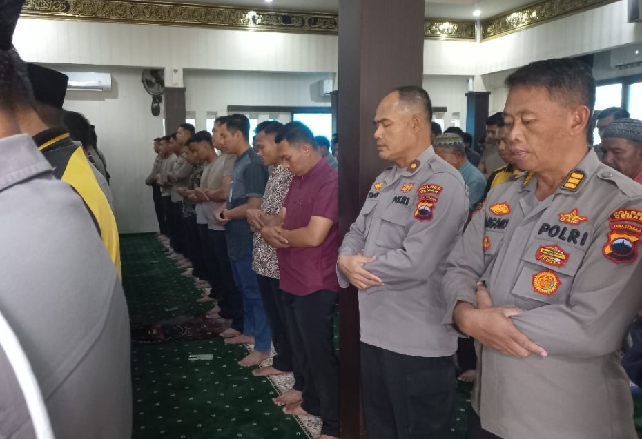 Shalat gaib dilakukan di Masjid Uswatun Hasanah Polres Demak dipimpin oleh Kyai Sobari diikuti oleh pejabat utama, anggota Polres Demak dan masyarakat sekitar, Jum’at (29/8/2025).