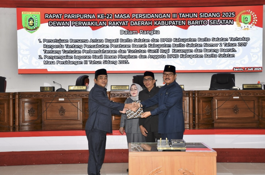 Ringkasan : Wakil Bupati Barito Selatan (Wabup Barsel) Khristianto Yudha Sampaikan Pidato Bupati Barito Selatan Eddy Raya Samsuri Tentang Persetujuan Bersama Terhadap Rancangan Peraturan Daerah Kabupaten Barito Selatan Tentang Pencabutan Peraturan Daerah Kabupaten Barito Selatan Nomor 2 Tahun 2017 Tentang Tuntutan Perbendaharaan dan Tuntutan Ganti Rugi Keuangan dan Barang Daerah pada Rapat Paripurna ke-22 (dua puluh dua) masa persidangan III (tiga) Dewan Perwakilan Rakyat Daerah Kabupaten Barito Selatan tahun 2025.