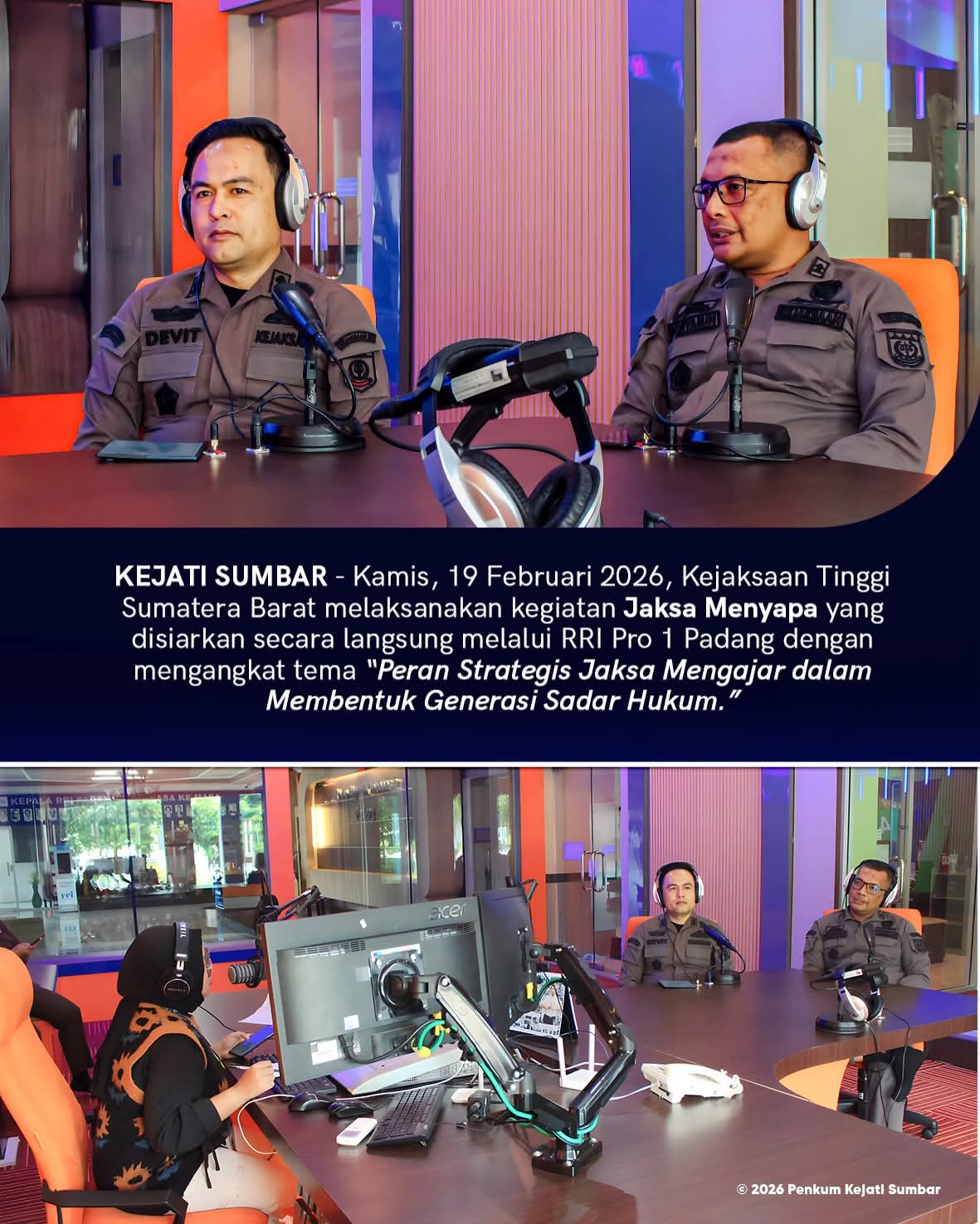 SUMBAR | Suasana siaran di RRI Pro 1 Padang, Kamis (19/2/2026), terasa berbeda. Bukan sekadar dialog rutin, melainkan ruang edukasi yang menghadirkan wajah hukum lebih dekat dan lebih membumi. Kejaksaan Tinggi Sumatera Barat memanfaatkan gelombang radio untuk menyapa masyarakat melalui program “Jaksa Menyapa” dengan fokus pada penguatan Program Jaksa Mengajar.